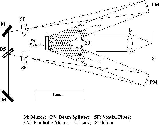 A, B を2方向より入射する.その入射角 2q は干渉縞の周波数が F になるように設定する.干渉縞の記録後,乾板を現像・定着する