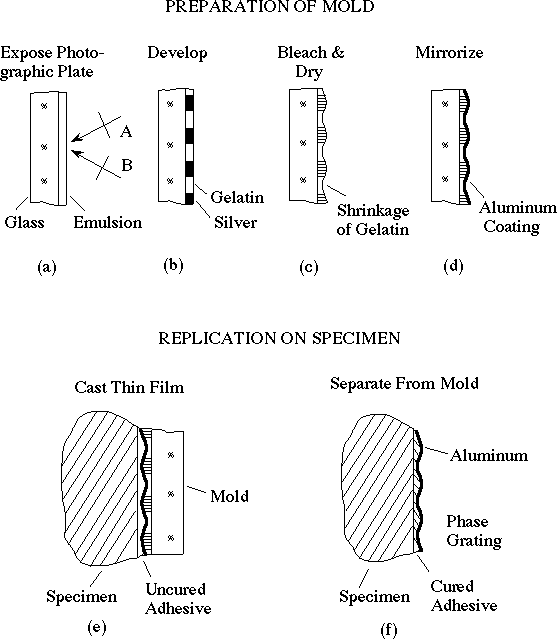 Fig. 2. Steps in producing phase-type specimen gratings and replication