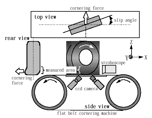 図1にフラットベルト式コーナリング試験機に試験タイヤ及び計測装置を設置した例を示し,図2には本計測システムの概略図を示す.タイヤ接地面近傍のサイド部に柔軟性のある二次元格子を貼り,その変形を2
