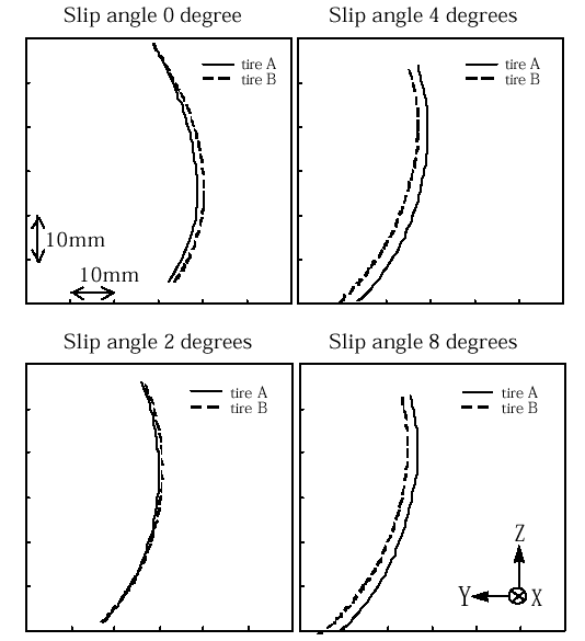 図10,図11にそれぞれのタイヤの各スリップ角におけるサイド部の三次元形状を示す.スリップ角が大きくなるにつれ,サイド部が旋回内側に相当する方向へ大きく変形している様子が判る.また,図12に各スリップ角におけるタイヤAとBの接地中心部の断面形状の比較を示す.直進走行時(スリップ角0°)では剛性の低いタイヤBがタイヤAより外側へ変形している.また,スリップ角を付与していくとタイヤBがタイヤAより旋回内側に相当する方向へ大きく変形しているのが判る.