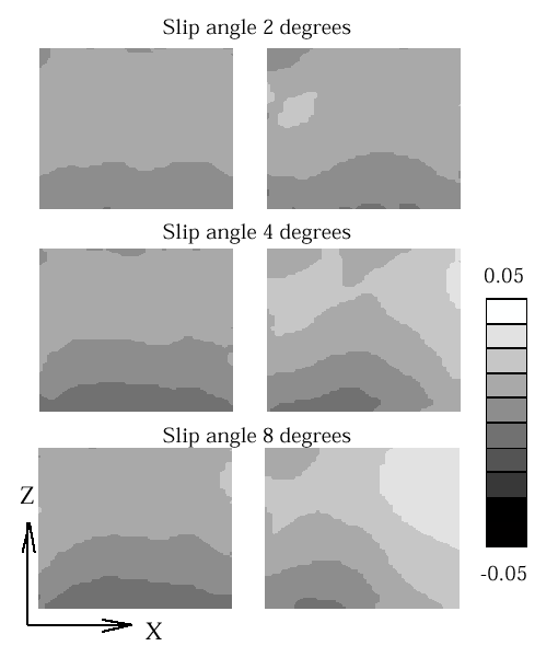次に図13に直進状態(スリップ角0°)を初期形状として各スリップ角における形状から前後方向(X方向)の表面ひずみ分布を計算した結果を示す.剛性の低いタイヤBはタイヤAに比べスリップ角が増すにつれて引張りひずみレベルが大きくなっていることが判る.