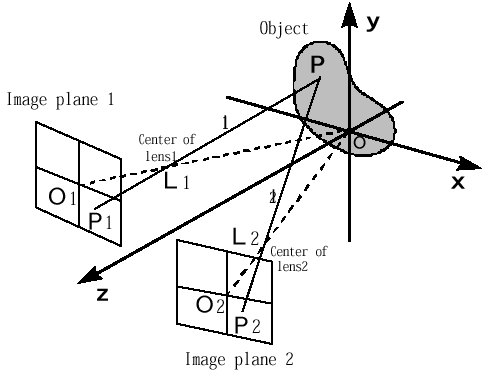 及び光軸O 〜L1,O 〜L2 )から,その三次元空間内における2本の直線l1,l2が得られ,その交点を計算することにより,点P