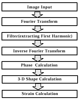 の空間座標(x,y,z)が求まる.これを格子画像全面について行なえば物体の三次元形状を得ることができる.また,変形前後で点と点との対応が取れているため変位を微分することにより表面ひずみ分布を解析することもできる.画像処理のフローを図4に示す.
