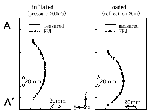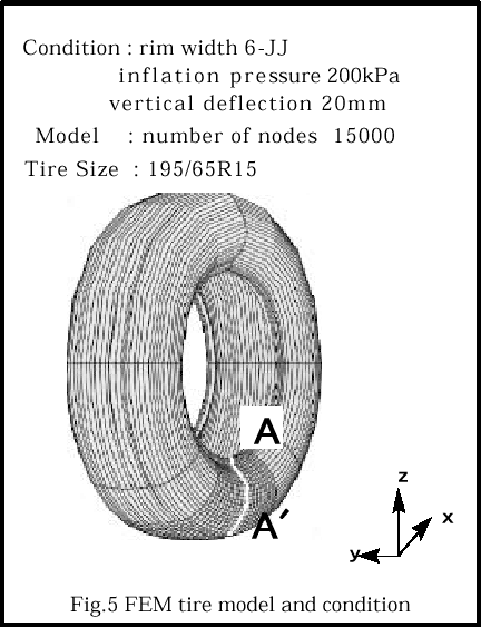 に示すFEMタイヤモデルの検証を試みた.結果の比較は所定の空気圧に充填した場合と縦たわみを与えた場合の接地中心部のサイド部断面形状(図5のA−A$(BIt!K$G9T$J$C$?!%