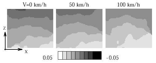 方向)の表面ひずみ分布を示す.速度の増加にしたがい,接地面側で引張りひずみの大きい領域が拡大していくのが判る.