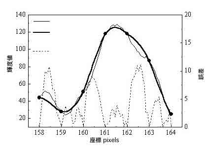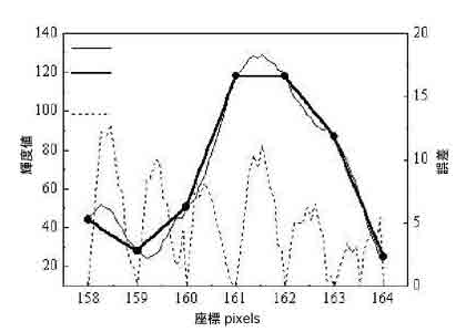 この方法を用いて変位計測を行なう場合,変形前後の画像を取り込み(図2),画像相関を取って,対応点を検索するのが通常の方法である.実時間あるいはそれに近い測定を行なうためにはCCDビデオカメラを用いて連続的に画像を取り込むのが普通であるが,通常使われるNTSC方式のビデオカメラではその解像度は640×480画素であり,変形前後の2枚の画像から1画素単位の対応点を探索するものとすれば,測定できるひずみの大きさは最小でも1/640=1.56×10-3であり,1×10-3以下の精度を得ることはできない.測定精度を良くするためには1画素以下の精度で対応点の探索を行う必要があり,そのために各種の方法が報告されている.Suttonらは画素間の内挿により0.02画素の精度で対応点探索を行い,200×10-6のひずみを測定できる方法を報告している(6).また,著者らも図4に示すように画素間の輝度を5次式を補間式として用いて内挿し,繰返し計算を行うことによって比較的に簡便な方法により高精度の対応点探索を行う方法を報告している(12).また,この方法の精度を上げるためには画像の諧調を多くすることが一つの方法であるが,通常のモノクロ用の画像キャプチャーボードでは輝度諧調が8bit,256階調のものが一般的である.そこで,RGBのカラー画像を用いれば,各色8bitで1600万色を表現することができ,諧調がそれだけ上がることになる.そのような理由からカラー画像を用いた方法も報告されている(7).
