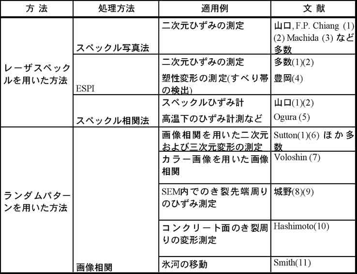 最近の光学的方法によるひずみ測定法が文献(1)にまとめられている.広義の意味でのスペックルパターンを用いたひずみ計測法については,表面にスペックルパターンを付ける方法によって大きく分けて,(1)粗面にレーザを照射した場合に生じる散乱光の干渉によるレーザスペックルを用いる方法と,(2)表面の凹凸による陰影などあるいは塗料などを吹き付けることによりランダムパターンを作成する方法とがある.比較的最近報告されたものをそれぞれの手法あるいは用途によって分類すれば表1に示すようになる.