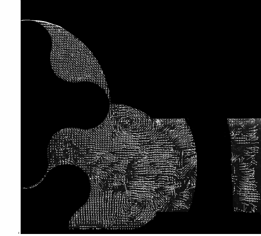 流体の分野では,トレーサ粒子の挙動をPIV(画像処理流速計)で計測し,速度場を得る.これをもとに流体の速度,渦度等の特性が議論される.以下に2例を示す.他に,噴流,温度層状流など流路内流れや流体機械等の機器内の流れの計測が行われている.