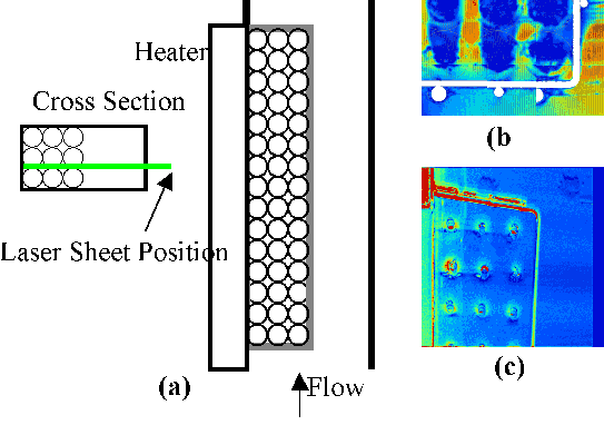 ガラス球(φ20)を格子状に組んだ閉塞物(3×3×15個)が局所的に流路に存在するような流路(Fig.3(a))の内外の流動を可視化‐画像処理流速計で計測した結果を示す2)-4).閉塞部入口部の速度場をFig.3(b)に示す.局所流動の特徴が得られている.また,側壁を加熱した場合の流路内温度特性をレーザ誘起蛍光法(LIF)により計測した結果を示す