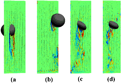 cm の空気気泡のそれぞれが上昇する様子と周囲の速度場を示す.固体粒子または気泡は黒色で表されており,その周りの水の測定面内2次元速度がベクトルで表されている.また,速度ベクトルより算出した渦度が濃淡で示されている.これらの結果から,ほぼ同じ大きさの粒子であっても,浮力(周囲流体との密度差)によって発生する後流の構造に違いがあることが分かる.粒子運動と関連付けて考えると,水と密度差の少ない固体粒子の場合,固体粒子は直進し,乱れも粒子に対してほぼ対称な形をしているが,水と密度差の大きな固体粒子では,粒子がジグザグ運動し後流の対象性も失われることが分かる.また,偏平固体粒子の場合は,密度差はそれほど大きくないが,非球形である効果によりジグザグ運動し,後流も対称ではない.気泡の場合は,非球形であることや変形する効果を含むが,水と密度差の大きな固体粒子と同様なジグザグ運動あるいは螺旋運動し,後流の対象性が失われているのが観測される.HPIVにより計測された界面の輪郭と粒子周りの鮮明な速度場は,従来のPIVでは計測できなかったものである.