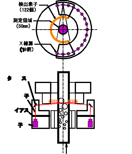 流れが,可視光線で透視できない場合には,可視光線よりも波長の短い電磁波が利用される.高速X線CTスキャナ−を利用して,流路横断面上のボイド率分布の構造,ボイド率分布,気相流速を測定し,得られたボイド率情報を画像化し,流動状況を可視化できるようになった.Fig.6に高速X線CT装置の概略を示す.この装置では,一断面のスキャン時間が3.6msec,撮影速度は250コマ/秒,空間分解能は約2mmである.