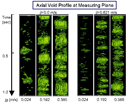 Fig.7は,内径42mmの垂直管内を流れる窒素ガス気泡の形状を,高速X線CTを用いて可視化した例9)である.測定面を通過する砲弾型をしたスラグ気泡の断面が8ms毎の時系列で記録されている.また,Fig.8は1秒間に得られる250枚の断層像を重ねて,側面から可視化したものになっている.流路断面におけるこれらの多次元的な界面形状は,従来のプローブを用いた計測法では測定できなかったものである.