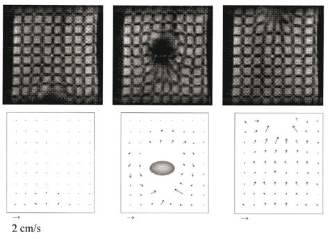 Fig.9は,超高速NMR影像法の手法であるπ-EPI法により,垂直円管(内径16mm)内の単一上昇気泡周りの流動を可視化したものである10).液相はセルロース水溶液(1wt%)である.測定面は,単一気泡生成ノズル下流3cmを中心とする19.2mm×19.2mmの管軸を含む領域で,画素数は64×64である.流動の可視化手法には振幅法を用いた.振幅法は磁気的に正方格子パターンを流体に付け,そのパターンの変化により流動の様子を示す方法である.格子パターンは高周波磁場により水素の核スピンを励起することにより得られる.水素原子は水の一部であり,水が流動すれば,格子パターンも共に移動・変形する.Fig.9の上列は0.2秒間隔で撮られた3枚の連続NMR画像で,等価球直径3.9mmの気泡が測定面に進入し,出て行くまでを示す.真中のNMR画像では気泡を測定面中央部に捉えている.気泡の輪郭は振幅法を用いているためはっきりとしないが,水の流動状態が格子パターンの変形として直接見てとれる.また,下列はそれぞれ上側のNMR画像から読み取った測定面内速度ベクトルの分布である.気泡上部では気泡が水を押しのけるため水は上方及び斜め上方向に流動し,気泡側面では水は下方へ流動し,気泡下部では気泡通過後の空間を埋めるように水が流動する様子がわかる.
