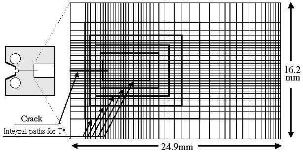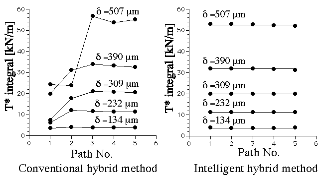 次に各ハイブリッド法について,き裂先端近傍場から求めたT*積分(17)値の経路独立性を調べた.図5は各変形段階,各経路について得られたT*積分値を示している.従来型ハイブリッド法では,計測誤差の混入により,T*積分の経路独立性が損なわれている.一方,インテリジェントハイブリッド法では,自動的に経路独立性が回復され,高精度なT*積分の評価が可能であることが分る.