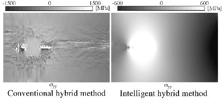 図3に,誤差最小化を行なわない従来型のハイブリッド法と本インテリジェントハイブリッド法による応力場を比較して示す.従来型では誤差による乱れが生じている.一方,本インテリジェントハイブリッド法によれば,実験計測誤差の自動消去が行われ,計測不能領域においても正確な変位の分布が得られていることが分る.