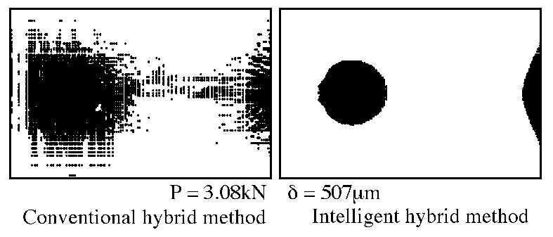 図4は各ハイブリッド法から得られた塑性域分布を示している.図は降伏が生じた要素内積分点をプロットしたものである.従来型のハイブリッド法の結果においては,実験計測誤差の影響により試験片の各所で塑性変形が生じたような結果が生じている.弾塑性解析計算では,降伏の発生はその後の変形挙動の評価に様々な影響を与える.そのため,一度,実験計測誤差によって誤った塑性変形が発生すると以後の解析結果の正当性が失われる.インテリジェントハイブリッド法では,実験誤差が自動消去されるため,不適切な降伏点の発生はみられず,塑性域分布について変形の進行に応じた正確な結果が得られている.