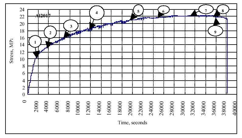 ,幅30mm ,厚さ5mm のダンベル型平板で,450 ℃雰囲気に1時間放置した後炉冷したものである.この試験片の両端をピンで支え,下側ピンを固定し,上側ピンを一定の速度で上方に引っ張った.引張速度0.5mm/sで引っ張った時の試験開始から破断までの応力の時間変化を図2に示す.ここで縦軸はロードセルで測定した荷重を試験前の断面積で割って得た公称応力である.降伏点を過ぎると,応力の増加率は減少し,(2)あたりから曲線にギザギザがのってくる.これは,アルミ合金などに典型的に見られる現象で,Portevin