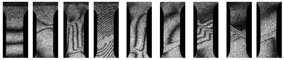 λ=532nm より,1フリンジあたりの変形量は376nm である.これらの縞の変化は,静止画でみると複雑で多様であるが,動画でみると変化のプロセスがよくわかる.図の9枚の写真は左から図2の番号に対応して順番にならべた.(1)は弾性変形域で一様変形が起こっていることを示している.(2)では中央上部に縞が集中していき,やがて右上がりに約45