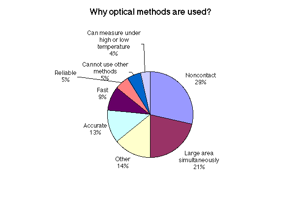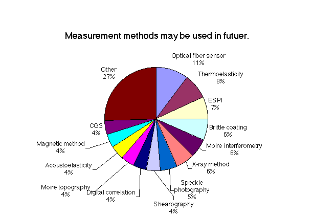図1はその結果の一部である.本アンケートの回答者は製造業7,大学・教育32,官公庁4,その他5となっており,圧倒的に大学関係者が多い.企業における実態を調査したいところであるが,なかなか回答を得られないのが現状である.図1より,多くの研究者や技術者が,非接触測定が可能,面データとして広い範囲での測定が可能であるという特性を認め,光学的測定法を使用していることがわかる.図1(e)(r)は光学的測定法には限らず,現在使用している測定法および将来使用したい測定法についての結果である.現在使用している応力・ひずみ測定法ではひずみゲージによる測定がかなりの割合を占めている.一方,将来使う測定法では,最近注目されている光ファイバーセンサー,赤外線応力測定法,電子スペックル干渉法等の光学的測定法が多い.このことから,多くの研究者・技術者が光学的測定法に対して注目しており,また,期待していることがわかる.